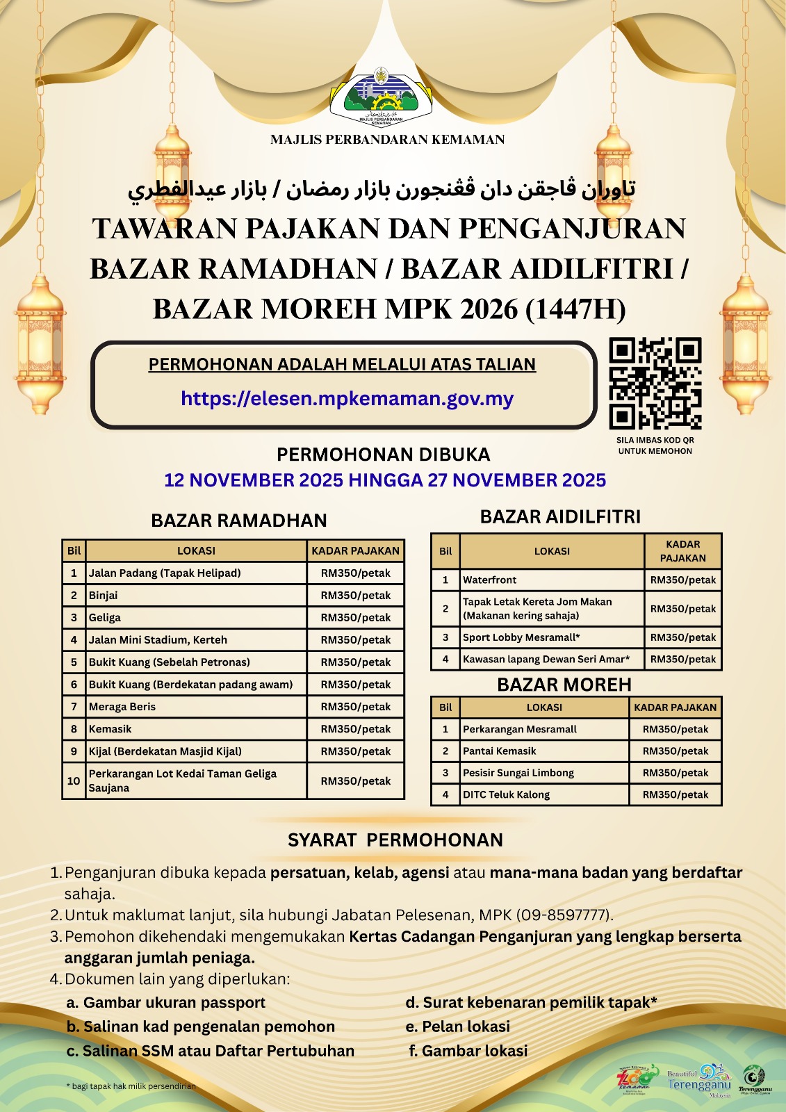Dimaklumkan bahawa permohonan untuk Penganjuran Bazar Ramadan 2026 / 1447H kini dibuka mulai 12 November 2025 hingga 27 November 2025.